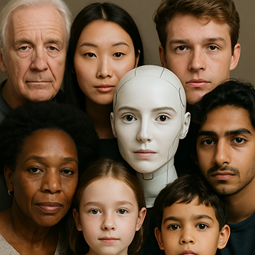 * Image Prompt: “Create an image with a cluster of human faces of different races, genders, and ages. Include one face that is a robot but still looks human.”