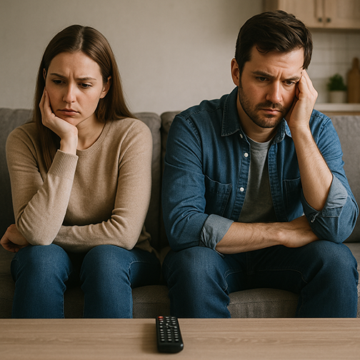 Image Prompt: “Please create a photorealistic image of a man and woman sitting dejectedly on a couch, a TV remote control sitting on the couch between them. They cannot agree on what to watch, and are just sitting there, silently, instead.”