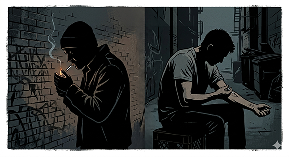 * Image Prompt: “Two figures in silhouette, one facing to the left lighting a cigarette, one facing to the right injecting himself with a hypodermic needle.”