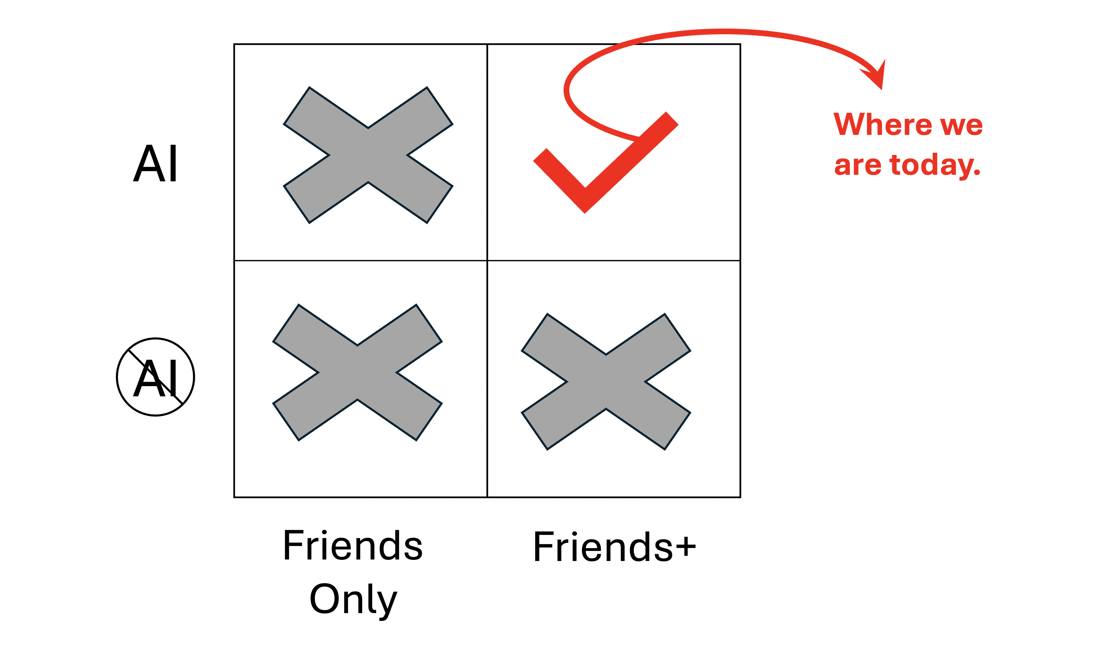 The bottom-left square represents the settings where the user would only see what their friends post in reverse chronological order. The bottom-right square would expand the degrees of separation so the user would see more, but still in reverse chronological order. The top-left square would personalize the user’s feed so that what the algorithm thought most relevant would come first but still restrict the content to friends-only.